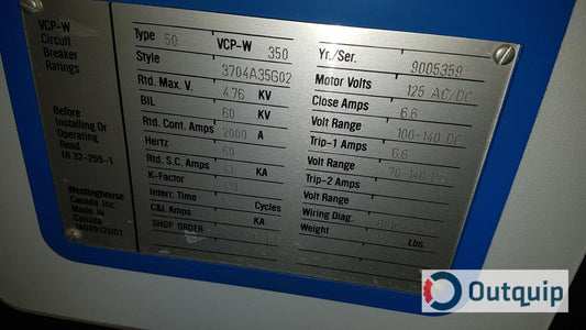 BREAKER,MAIN WESCO 2000 AMP,50 VCP-W350,5 KV *FOR 2400 VOLT BREAKERS AREA 630 ELECTRICAL